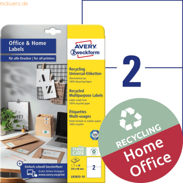 Recycling Universal-Etiketten; Verwendung für Druck- oder Schreibgerät: Inkjet-, Laserdrucker, Kopierer; Werkstoff: Papier; Naturweiße Etiketten aus 100% Altpapier, verpackt im Recycling-Karton. Helfen Sie mit beim Umweltschutz; Größe (B x H) oder (Durchmesser): 210 x 148 mm; Farbe: weiß; Anzahl der Blätter je Packung: 10 Blatt; Anzahl Etiketten (Blatt/Packung): 2/20 Stück;