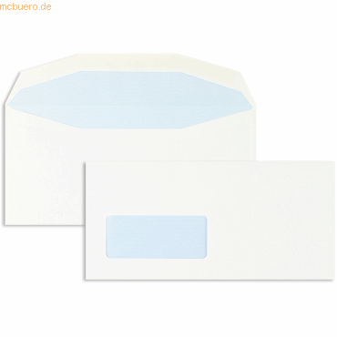 Briefhüllen; Format: 111×232 mm ; Verschluss: Nassklebung; Material: Offset; Farbe: weiß; Grammatur: 90 g/qm; Fenster: Sonderfenster; Innendruck: Blau;